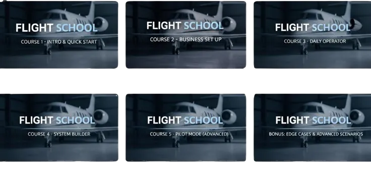 Flight School walks you through building a complete operational setup that handles leads, messaging, booking, follow-ups, and admin automatically. Set it up yourself for free, or upgrade and let our team build and optimize it for you.